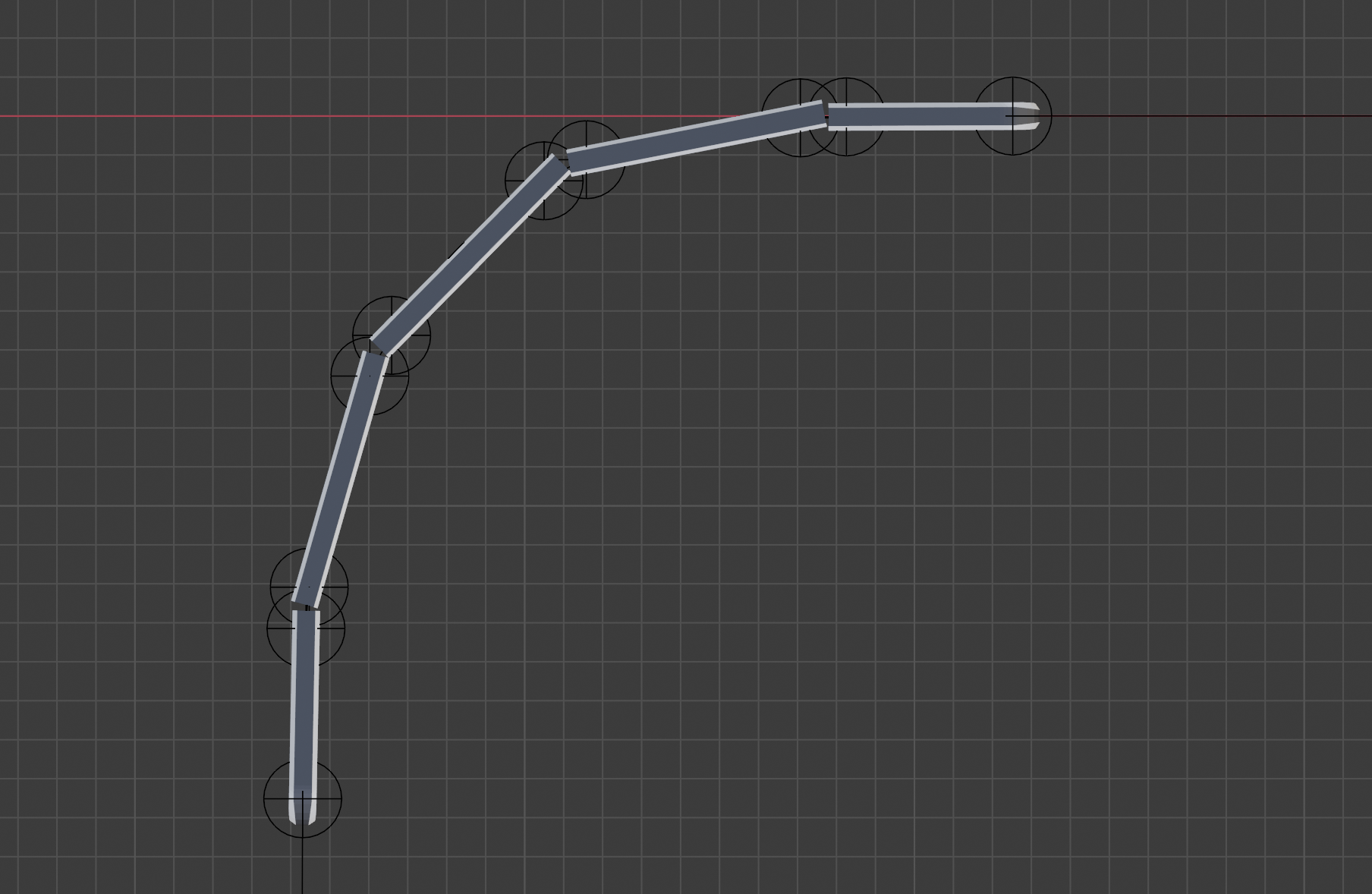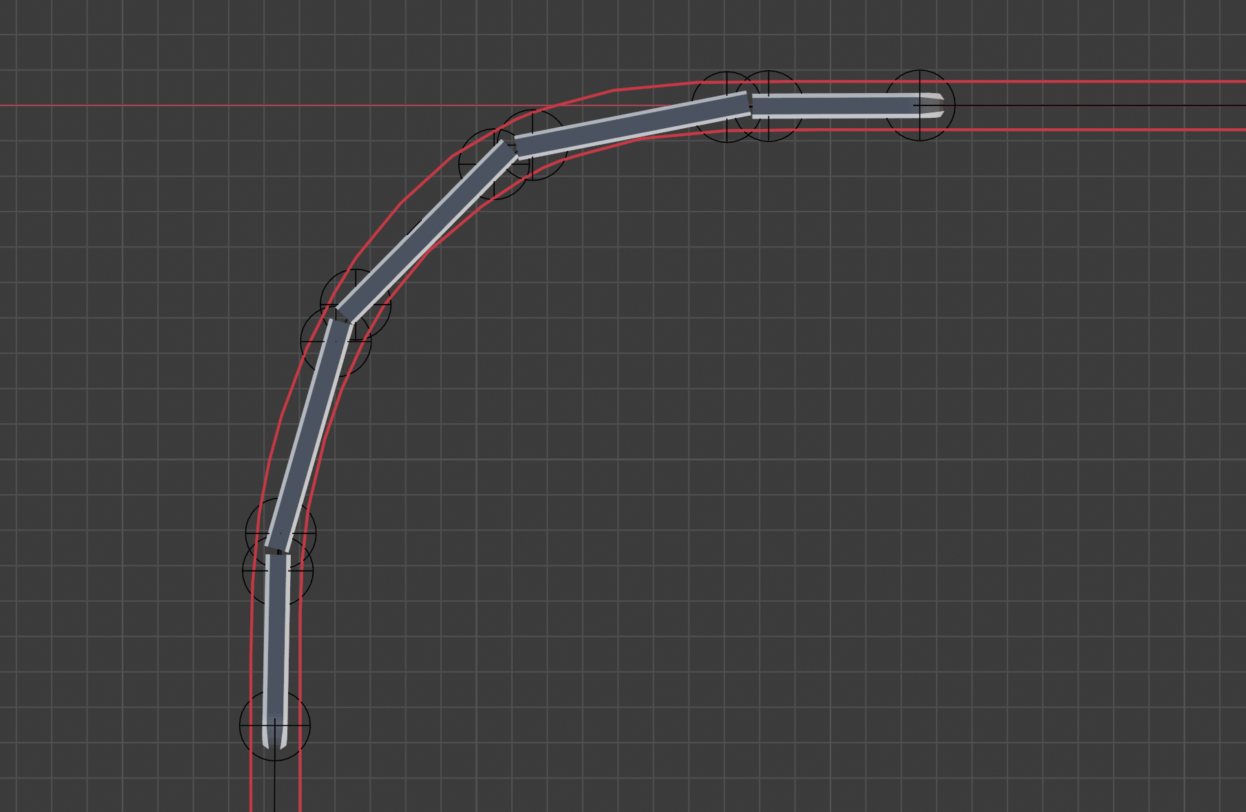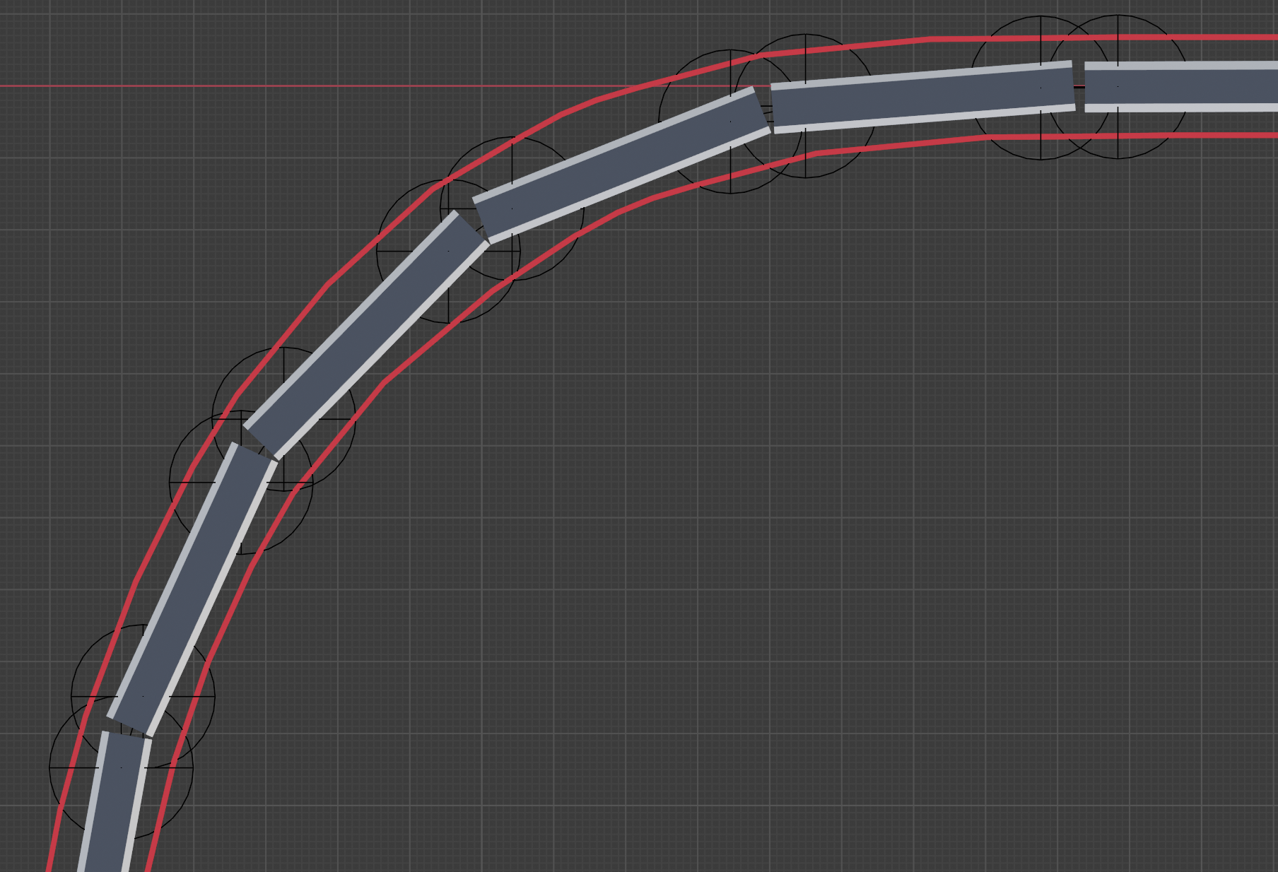 On se rend compte que chercher à rapprocher les bogies revient un peu à faire des caisses plus courtes. En effet, si on fait des caisses plus courtes (et donc plus nombreuses), l’inscription en courbe est meilleure. Dit autrement, en gardant le gabarit du train précédent, on voit que le simple fait de raccourcir les caisses permet de « discrétiser » un peu plus l’arc de cercle formé par le train. C’est comme créer un polygone dont on augmenterait le nombre de côtés, pour arriver jusqu’à un semblant de cercle.