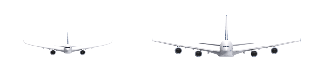 Dans les faits, si l’on parle de masse à vide avec équipage mais sans carburant (on parle alors de MZFW en aéronautique, pour Maximum Zero Fuel Weight), l’A350-900 a une masse d’environ 195 tonnes (selon les versions), tandis que l’A380 a une masse de 370 tonnes (selon les versions). En aéronautique, le super jumbo est donc bien plus lourd que les appareils à plus faible capacité, et au fond, ça semble assez logique.