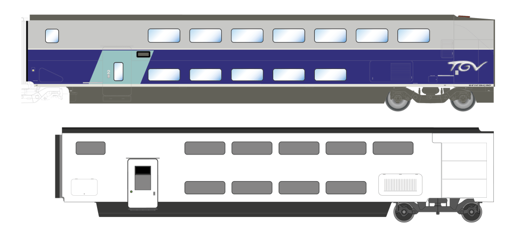 Cela dit, l’idée étant d’avoir un nouveau matériel aux caractéristiques relativement proches des rames existantes (de sorte à ce que leur grande capacité ait un impact le plus faible possible sur l’utilisation des rames en commercial, et sur leur adéquation aux infrastructures du réseau), si l’on garde la même longueur et la même largeur pour les nouvelles remorques capacitaires, on ne peut plus jouer que sur la hauteur disponible, et donc créer des voitures à étage (ou à « 2 niveaux », c’est comme vous préférez).