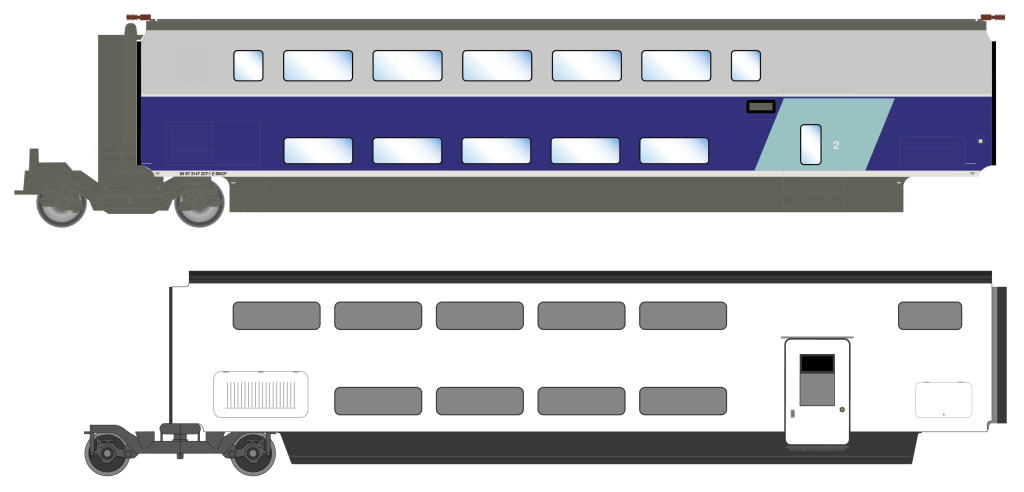 Après avoir comparé les motrices du TGVM avec celles du Duplex, et pour ce que cela vaut (sous réserve que les documents soient à l’échelle), comparons les remorques TGVM ainsi déduites du profil diffusé, et le diagramme latéral d’une Duplex reproduite au 1/87.