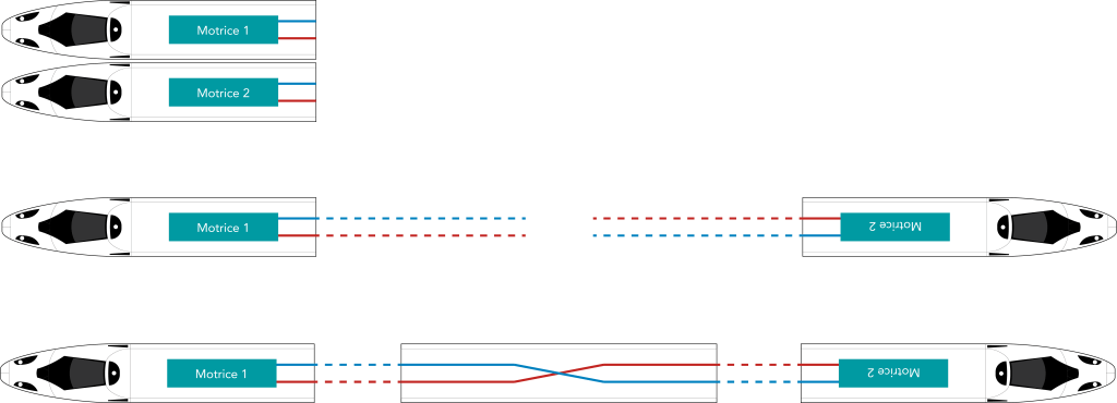 Pour schématiser grossièrement l’idée, si l’on considère un fil « + » et un fil « – » sur chaque motrice, on devrait se retrouver, en milieu de rame une fois les motrices mises « dos à dos », avec un souci : un fil « + » faisant face au fil « – » de la seconde moitié du train, et inversement. Il faut donc qu’une remorque particulière soit systématiquement intégrée au train, quelle que soit sa composition, pour permettre le croisement des câblages.