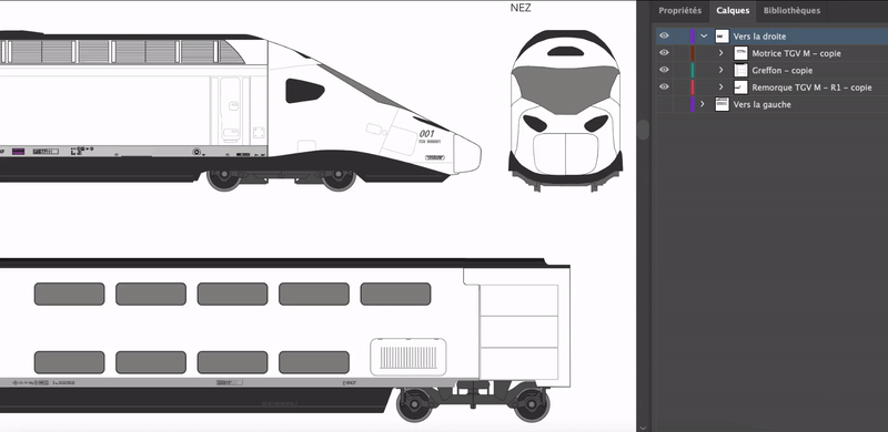 Quand j’ai commencé à réfléchir et faire mes différentes recherches pour le concours « Imagine TGVM » en septembre 2020, j’ai d’abord téléchargé le fichier PDF fourni, présentant le profil du train, et l’ai ouvert avec Adobe Illustrator. Si le profil du train était bien là, regroupé en plusieurs calques, leur nomenclature a quelque peu attiré mon attention…