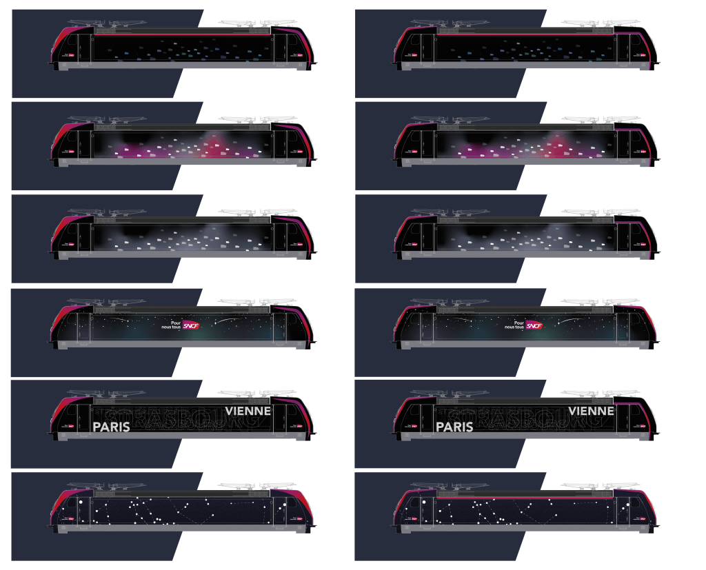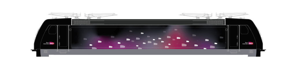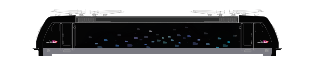 Au final, cela permet de faire 24 variantes de livrées, pour avoir quelque chose de cohérent et intégré à la machine, tout en mettant en avant l’image SNCF et en tirant profit de la base noire de la locomotive qui, je trouve, se prête à merveille à un support nocturne ou évoquant la nuit. Ce serait tellement dommage de laisser cela passer au profit d’un motif blanc !