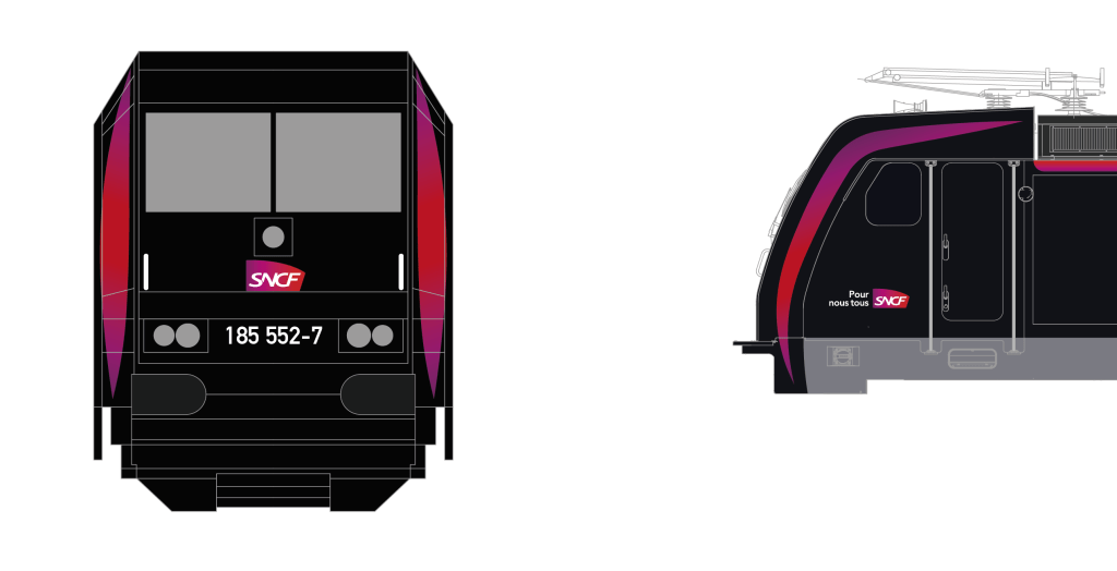 Bref, en résumé, la face avant de la machine semble « sauvée » même si certaines lignes des bandes frontales Carmillon sont assez…surprenantes. Au final, les contours des bandes frontales ne suivent en grande partie pas les arrêtes de la machine, et certains élans de découpes me semblent plutôt hasardeux voire expérimentaux. Cela reste néanmoins le plus flatteur à mon sens, surtout sur ce fond noir qui donne un certain éclat aux couleurs de SNCF. L’ensemble donne une vraie déclinaison de la livrée institutionnelle SNCF adaptée à la BR185, et c’est plutôt bien vu ! Avec une approche plus publicitaire que globale, j’imagine sans soucis plusieurs machines avec les éléments Carmillon, et la pose événementielle d’un motif central pour des occasions particulières. Ce n’est pas la direction que j’ai prise dans mes esquisses, préférant raisonner avec un ensemble uni et raccord (même avec plusieurs idées de bandes Carmillon), mais c’est défendable. Tout dépend en effet de ce qui est recherché, de ce que l’on souhaite procurer.
