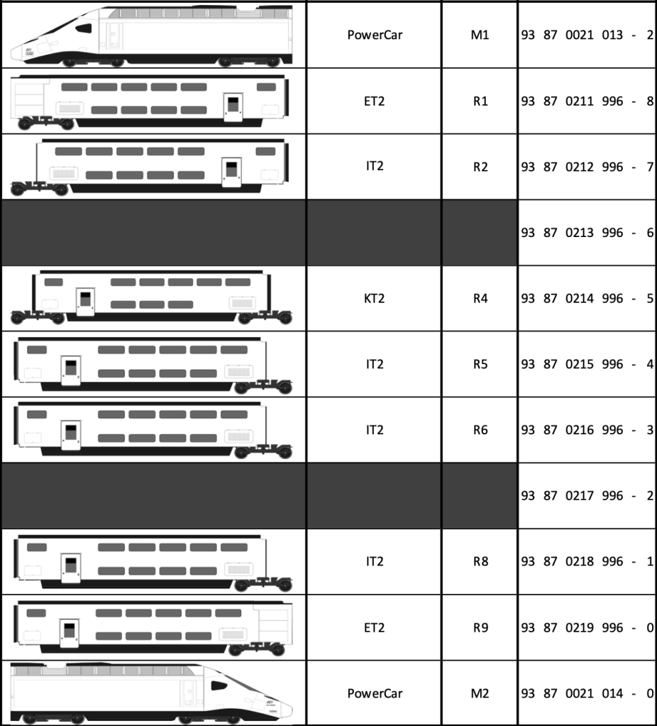 La remorque en 2ème position est, en revanche, bien numérotée 2. Il manque une remorque 3 entre les deux, forcément du type IT2/BT2 selon l’infographie ci-dessus. Dit autrement, non, la remorque en 2ème position ne peut pas être une remorque BT2. En effet, le bar est présenté comme toujours attenant à la KT2. La remorque 2 est donc nécessairement une remorque IT2, et le bar est bien absent de la composition de PS1.
