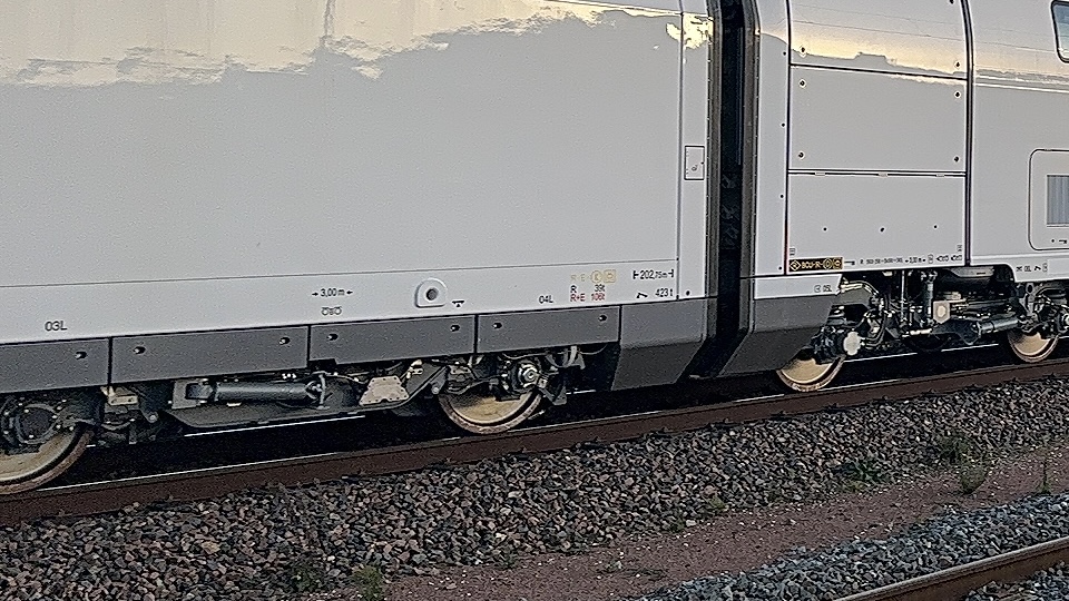 D’ailleurs, malgré les 2 remorques manquantes et après observation du tronçon, l’ensemble des essieux est numéroté à la suite, c’est-à-dire sans manque. Subtile… Cela laisse supposer que la rame restera dans cette configuration un certain temps, puisque le jour où elle passera à 9 remorques, il faudra reprendre l’ensemble du marquage pour le mettre en cohérence. Je doute que cela soit fait à Vélim, et que les remorques supplémentaires y soient acheminées au compte goutte. Gageons alors que PS1 restera à 7 remorques pour les essais, et il serait cohérent que PS2 soit en composition complète à 9 remorques pour les essais en France.