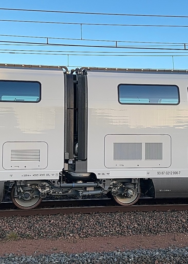 Je m’en rends d’ailleurs compte en écrivant ces lignes, mais l’essieu « côté tronçon » de la M2 est numéroté 21, alors qu’il était numéroté 25 lors de l’acheminement des motrices. Cela veut dire que le dernier essieu, celui le plus proche du nez de la motrice 2, devrait être l’essieu 24. Au passage, la logique de repérage des essieux/roues change complètement de ce que l’on connaît actuellement sur TGV.