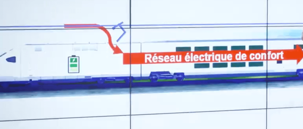 Jusque là, rien de très nouveau, mais cette modularité semble bien se concrétiser. En revanche, l’élément « nouveau » que l’on découvre sur cette vidéo, et qui va aussi beaucoup changer pour les voyageurs habitués des TGV actuels arrive, lui, à 0:14 : « Smartgrid ferroviaire : Basculement du réseau électrique de confort sur batteries internes« .