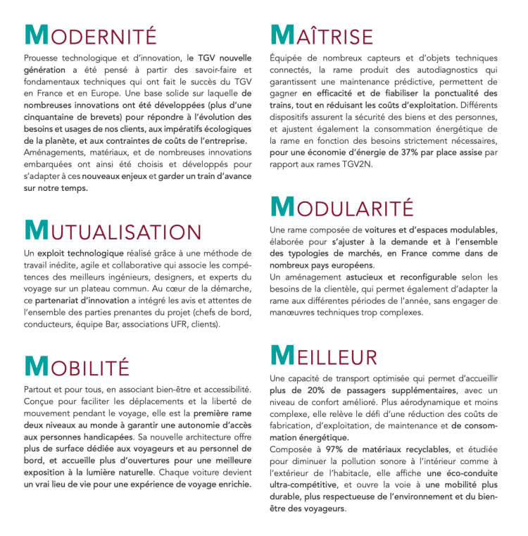 Avec la perspective de ce nouveau train, que l’on imagine révolutionnaire (dans le sens où il tire profit d’un héritage technique de plus de 40 ans en matière de Grande Vitesse, en conservant tous les grands principes de conception, mais réinventés au goût du jour), c’est finalement l’idée même du re-branding de TGV en INOUI qui transparaît. La démarche semblait en fait bien similaire : se réinventer pour être plus juste et plus pertinent, en phase avec son temps, être percutant. Son nom de code : TGV2020, à prononcer « vingt / vingt », pour « 20% plus capacitaire, 20% moins cher », les deux objectifs initiaux du projet. Finalement, le projet devient « TGV-M », pour sa modularité, et les nombreuses déclinaisons du M consignées dans un manifeste :